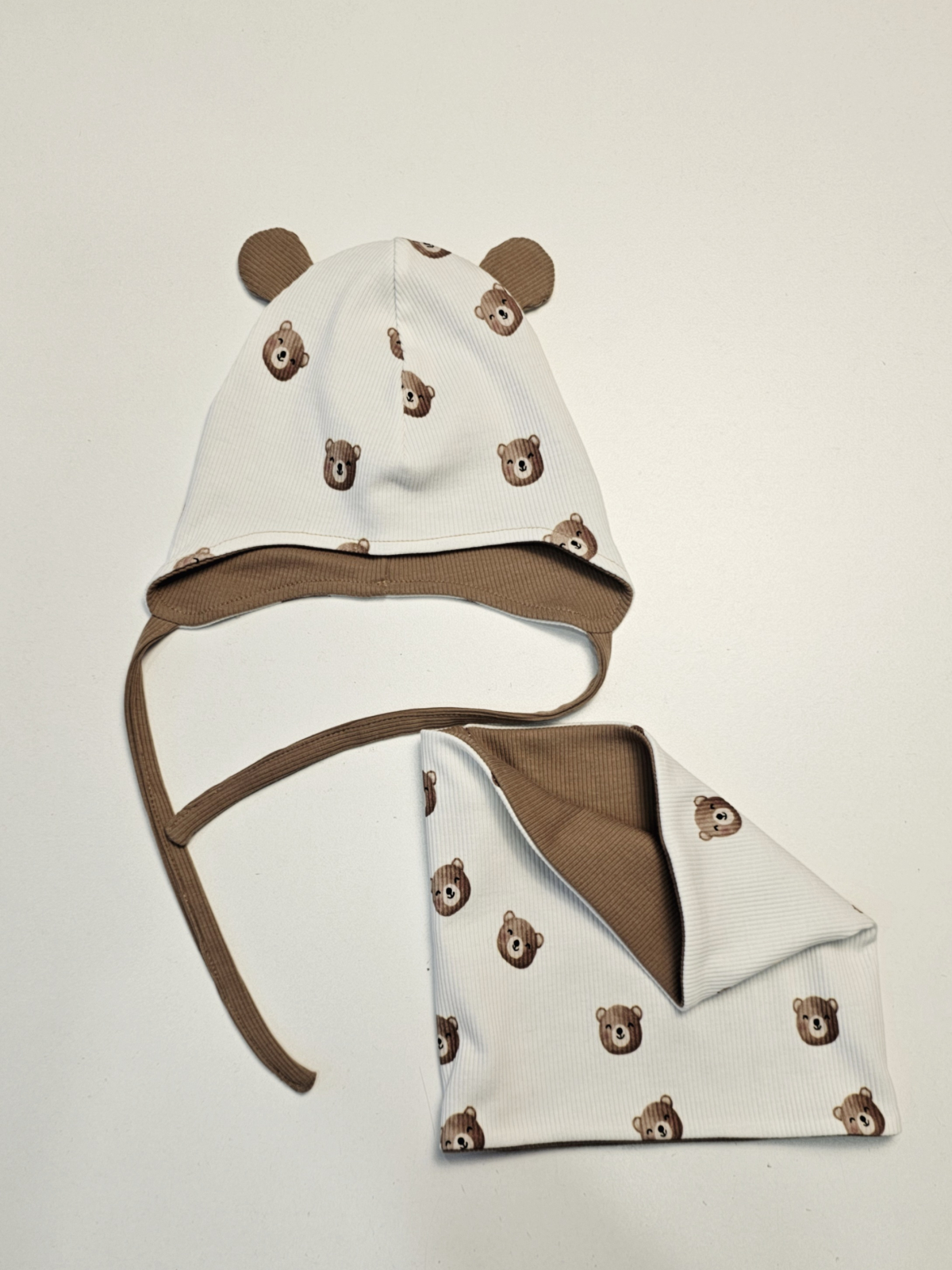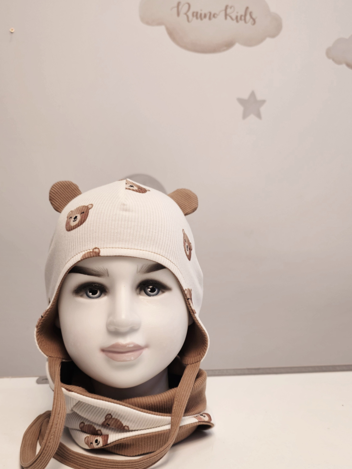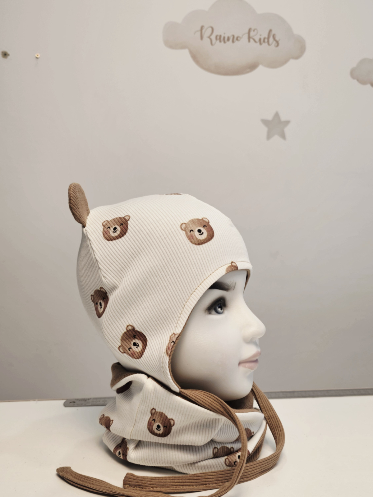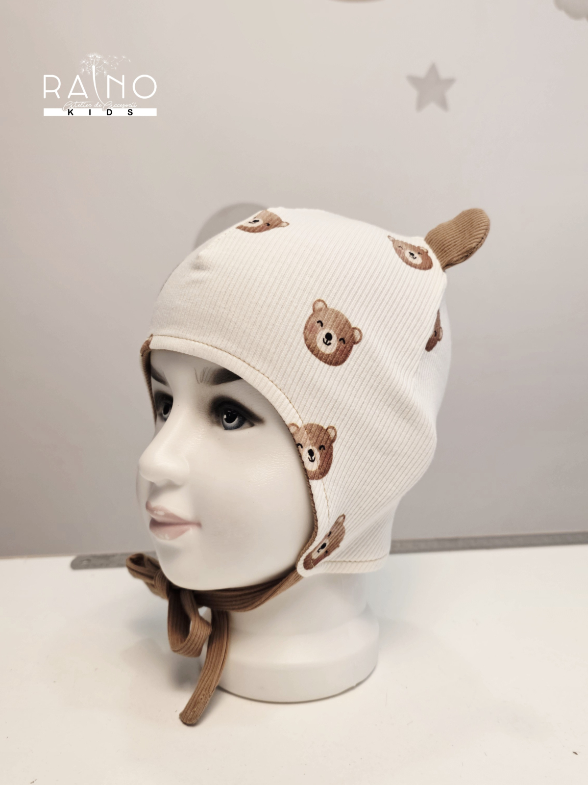 Căciulița este accesorizata cu urechiuse ursulet și se leagă sub bărbie.