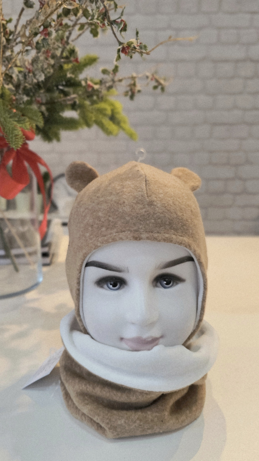 Călduros, moale și plin de farmec – aceast set compus din căciuliță cu urechi legată sub bărbie si esarfa circulara este creat în atelierul Raino Kids, cu grijă pentru pielea sensibilă a copiilor.