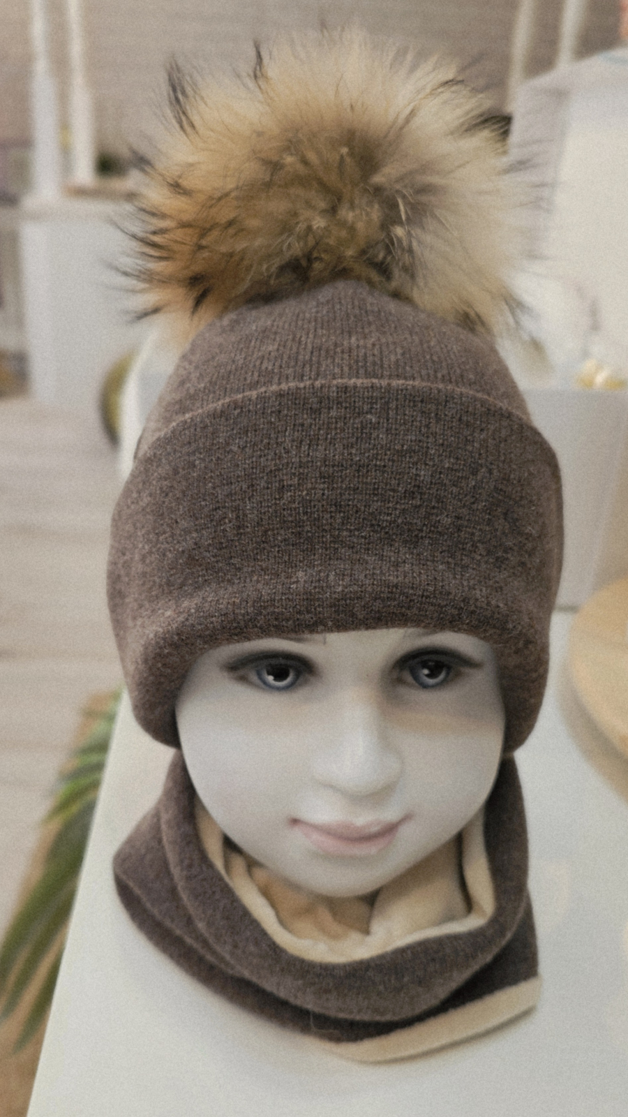 - căciulă din tricot lana 60%, bumbac 40%, culoare maro, accesorizata cu un moț din material natural, din raton, detașabil cu ajutorul unor capse. Moțul se detașează în momentul spălării!
