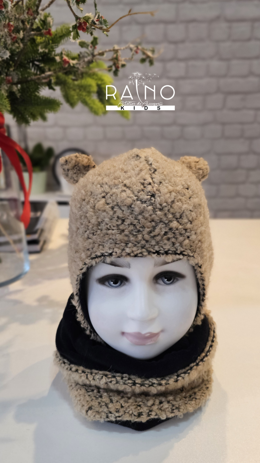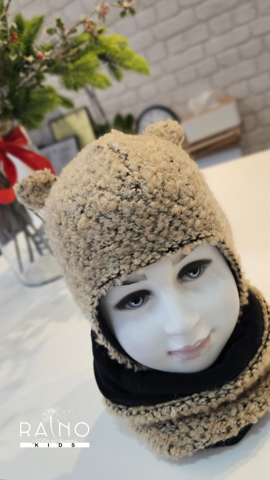 Călduros, moale și plin de farmec – aceast set compus din căciuliță cu urechi legată sub bărbie si esarfa circulara este creat în atelierul Raino Kids, cu grijă pentru pielea sensibilă a copiilor.