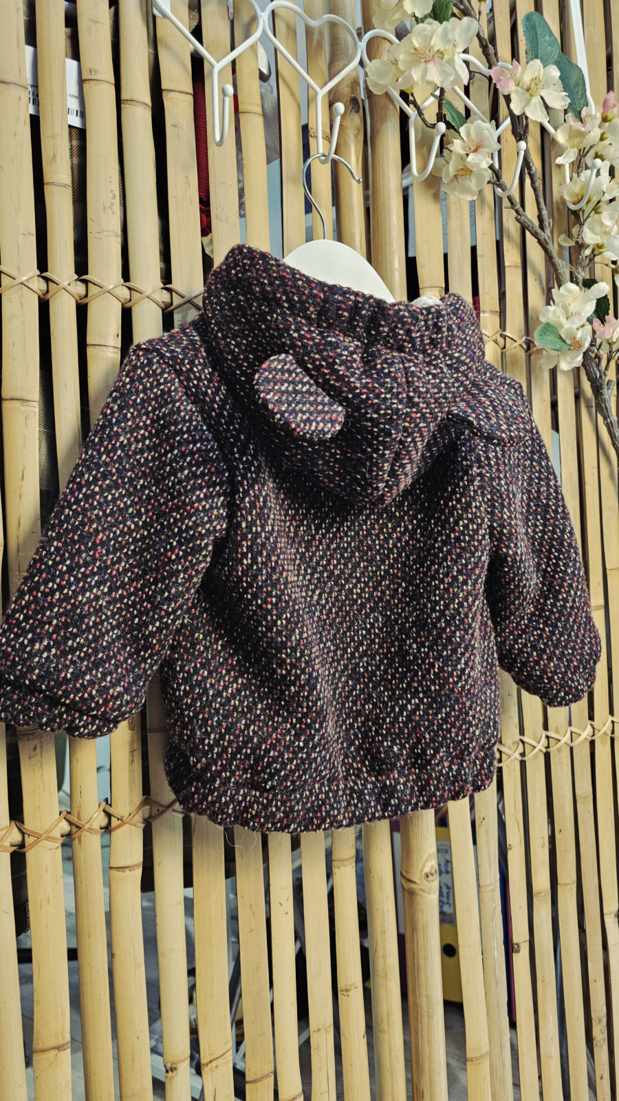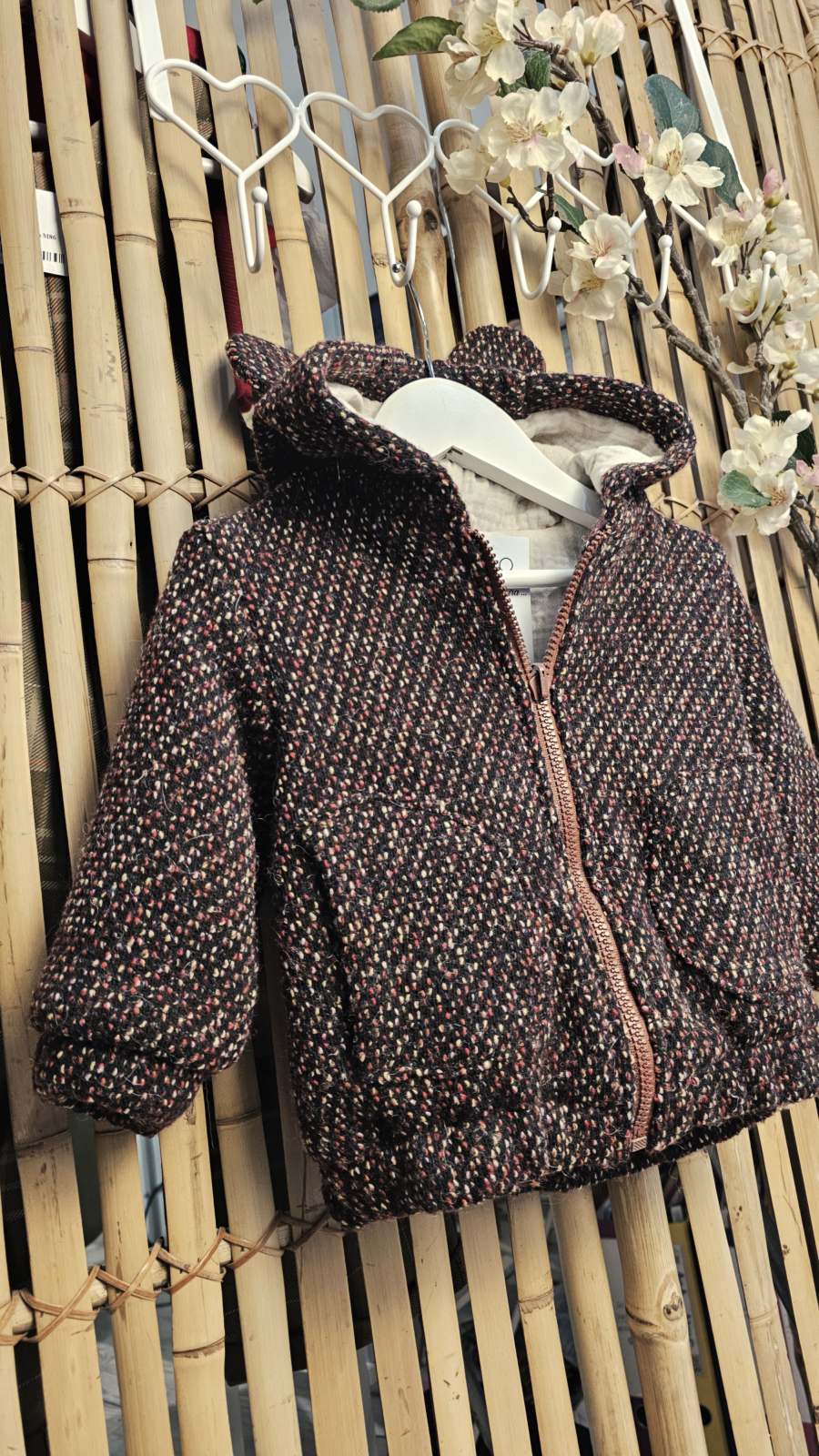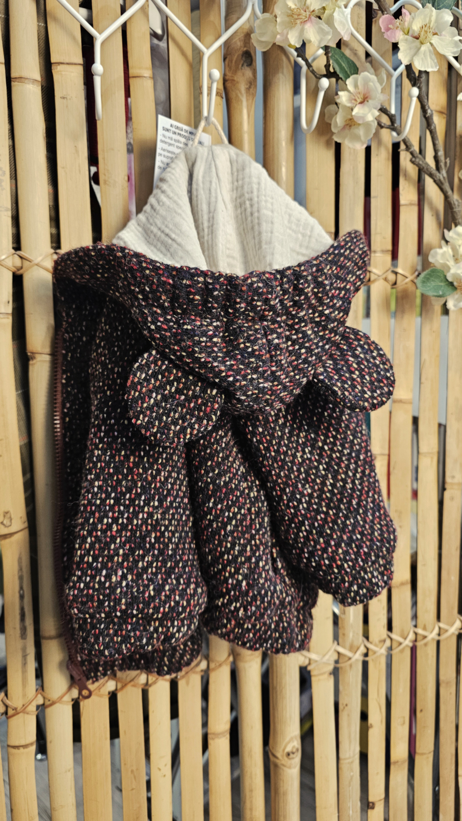Geaca model bomber este accesorizat cu o glugă cu urechi de ursulet