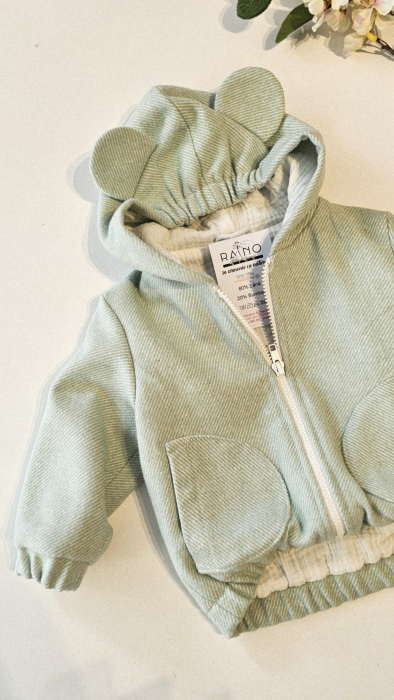 Geaca model bomber este accesorizat cu o glugă cu urechi de ursulet