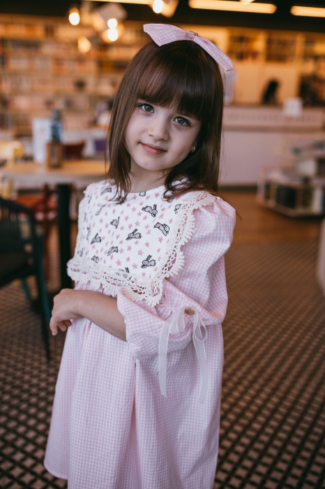 Culoarea este un mixt roz si alb, accesorizata cu guler din bumbac model iepurasi si dantela bumbac.